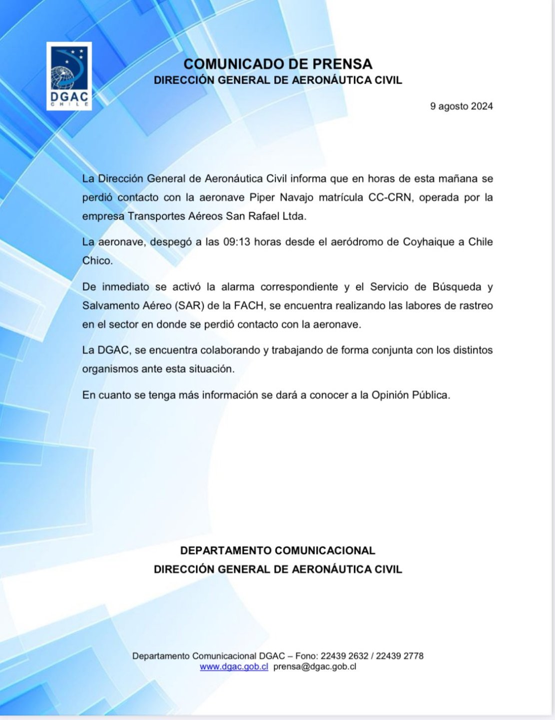 "De inmediato se activó la alarma correspondiente y el Servicio de Búsqueda y Salvamento Aéreo (SAR) de la FACH, se encuentra realizando las labores de rastreo en el sector en donde se perdió contacto con la aeronave", detalló la DGAC.