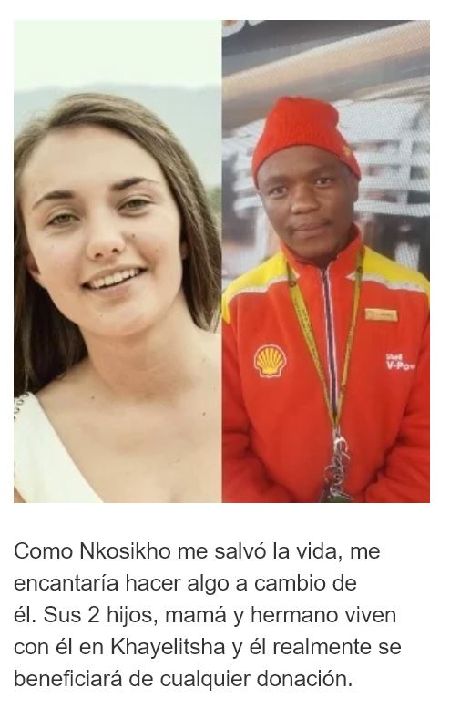 “No puede quedarse sin gasolina en la carretera N-2, es peligroso. Echaré 100 rands (unos 5 mil pesos) y cuando pueda me los devuelve”, le dijo Nkosikho Mbele a Monet van Deventer.