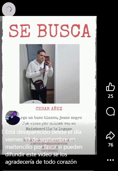 Al respecto, se confirmó que corresponde a una persona identificada como Cesar Añez, un ciudadano venezolano de 21 años que estaba siendo buscado desde el pasado 19 de septiembre.