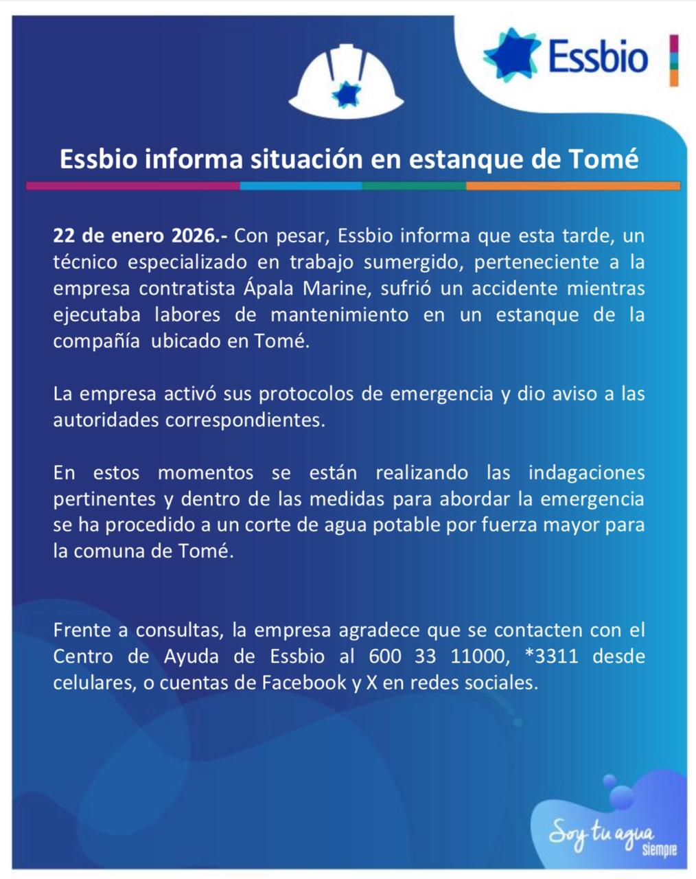 Tras esta tragedia, la empresa Essbio emitió un comunicado, donde señaló que un técnico especializado en trabajo sumergido, perteneciente a la empresa contratista Ápala Marine, sufrió un accidente mientras ejecutaba labores de mantenimiento en un estanque de la compañía ubicado en Tomé.