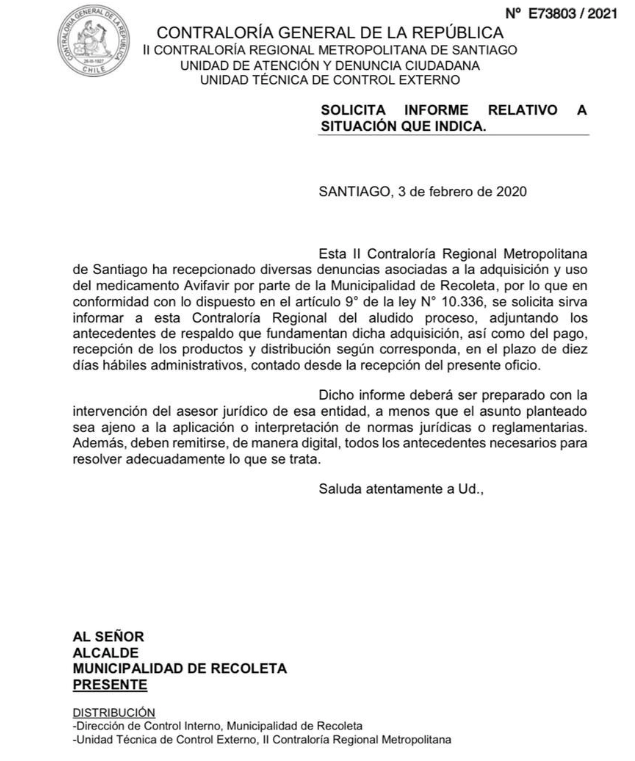 Lee también: Jadue responde a Paris por distribución de fármaco Avifavir: "Está muy mal informado"En el oficio, el organismo solicita los antecedentes de respaldo que fundamentan la adquisición del medicamento, así como del pago, recepción de los productos y distribución, según corresponda.