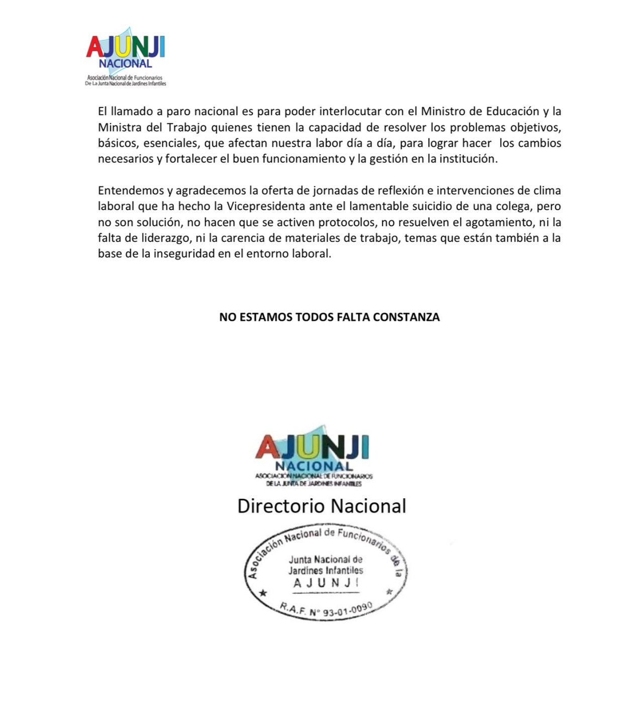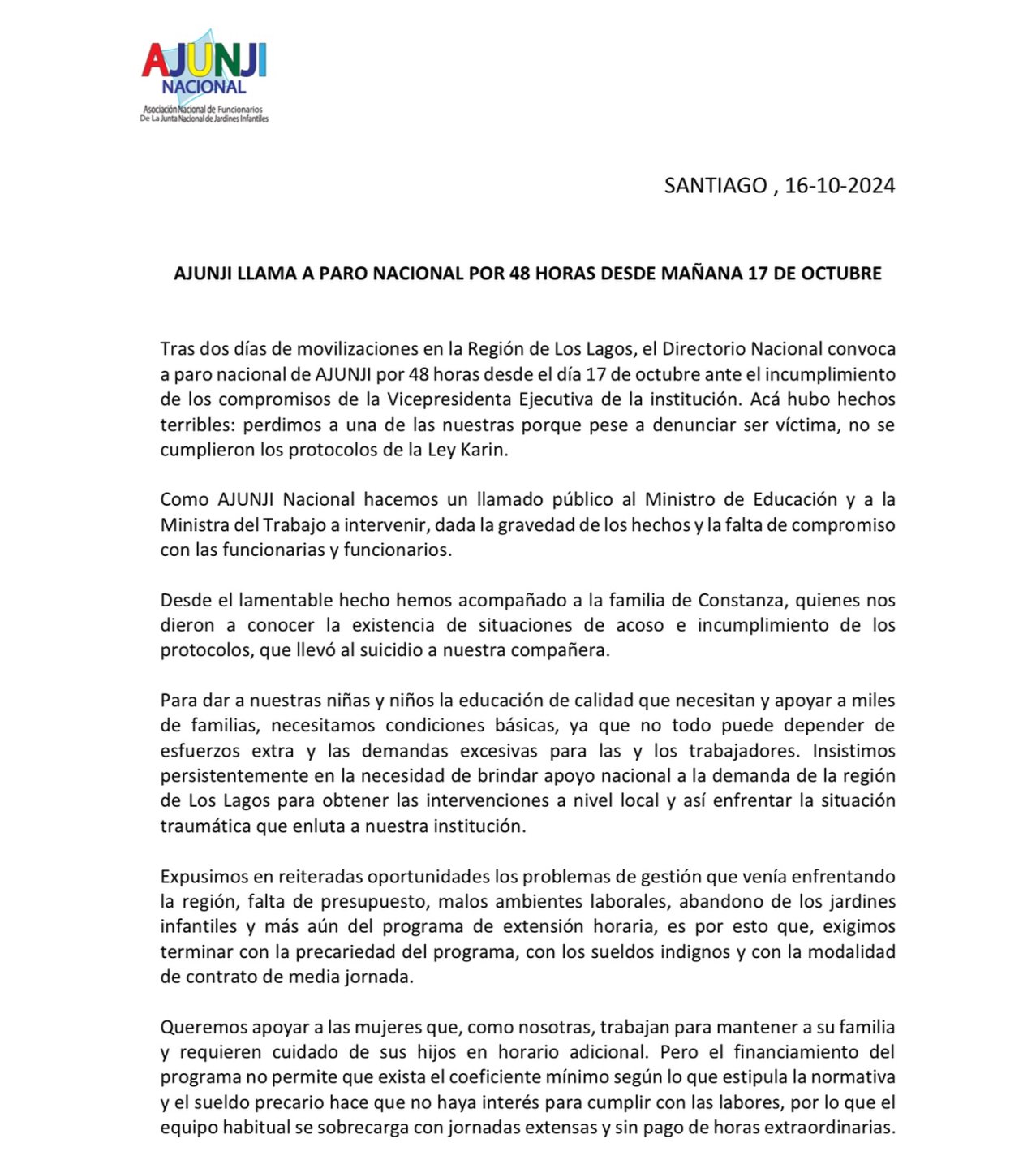 A través de un comunicado se indicó que "El Directorio Nacional de AJUNJI llama a un paro nacional de 48 horas desde el 17 de octubre debido al incumplimiento de los compromisos de la Vicepresidenta Ejecutiva de la Junji".