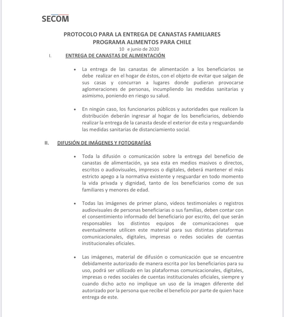 El documento, elaborado por la Secretaría de Comunicaciones (Secom), tiene fecha 10 de junio. Titulado como “Protocolo para la entrega de canastas familiares Programa Alimentos para Chile”, señala que las cajas deben ser entregadas en los hogares, “con el objeto de evitar que salgan de sus casas y concurran a lugares donde pudieran provocarse aglomeraciones”.