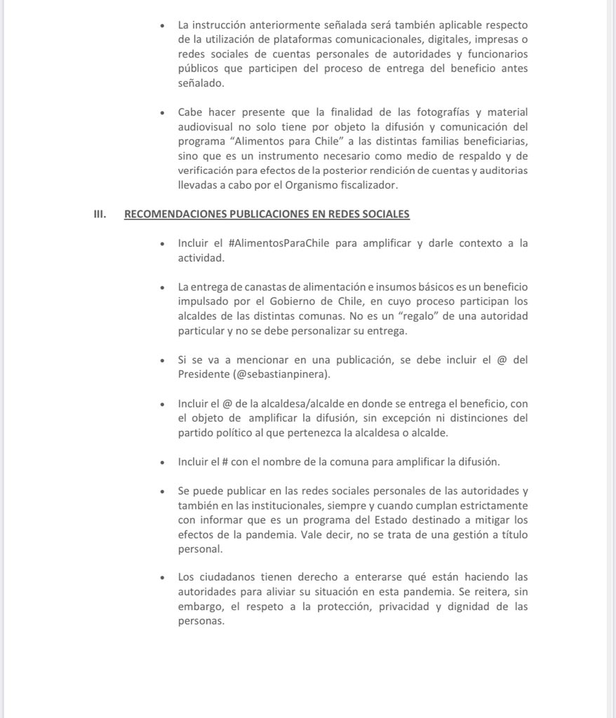 Lee también: Monckeberg por polémico instructivo de Alimentos para Chile: "Distrae de lo que es la distribución"Entre las recomendaciones para publicaciones en redes sociales, el instructivo llama a incluir el hashtag #AlimentosParaChile y, si se va a mencionar al presidente Sebastián Piñera en su publicación, incluir @sebastianpinera.
