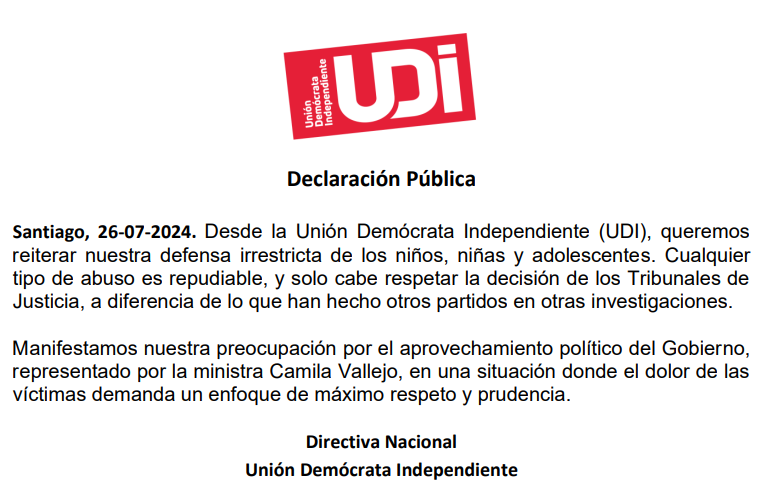 En este sentido, reiteraron una "defensa irrestricta de los niños, niñas y adolescentes. Cualquier tipo de abuso es repudiable, y solo cabe respetar la decisión de los Tribunales de Justicia, a diferencia de lo que han hecho otros partidos en otras investigaciones", indica el escrito.