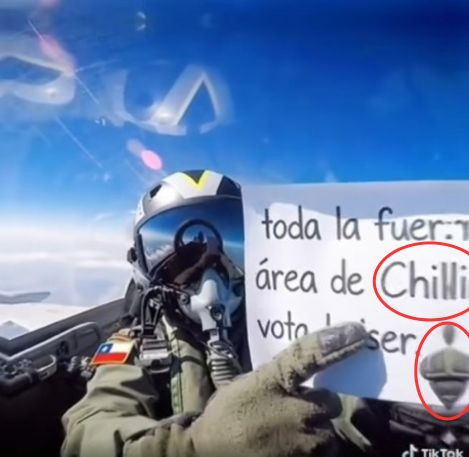 El metraje muestra a un piloto en un avión, grabándose a sí mismo, para mostrar una nota con el escrito “toda la fuerza aérea de Chile vota kaiser”.