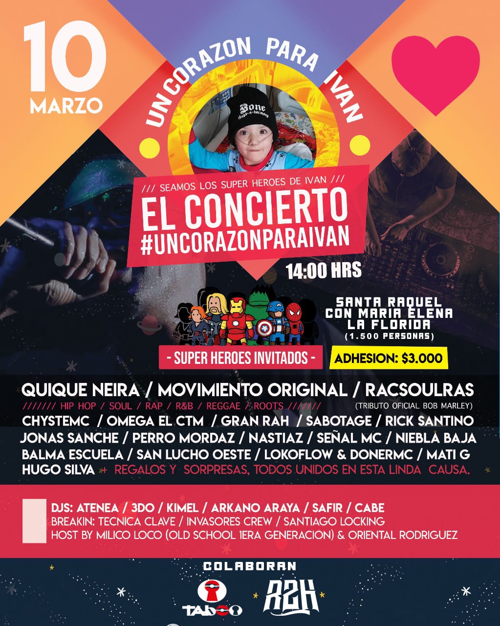 Ante este escenario, sus padres organizarán un concierto a beneficio de este pequeño fanático de los super héroes el próximo domingo 10 de marzo. El evento contará con la participación de Quique Neira y Movimiento Original, entre otros, y se realizará en Santa Raquel con María Elena, en la comuna de La Florida.