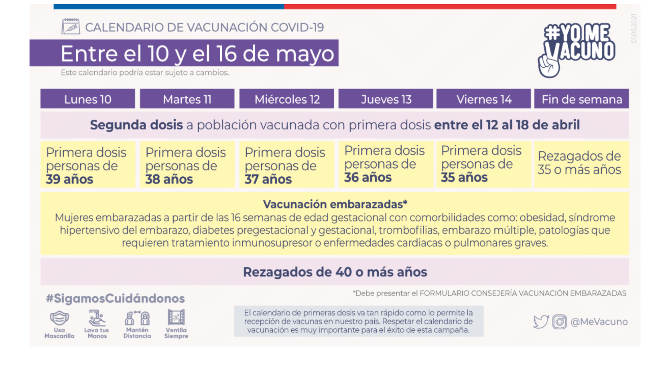 En el caso del COVID-19, entre el 10 y 16 de mayo se dará inicio a la inoculación de un grupo etario menor, dando paso a quienes tienen entre 35 y 39 años de edad.