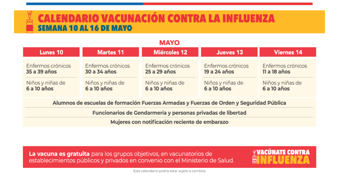 Por otro lado, las autoridades también han informado el calendario de vacunación contra la influenza desde el lunes 10 al viernes 14 de mayo.