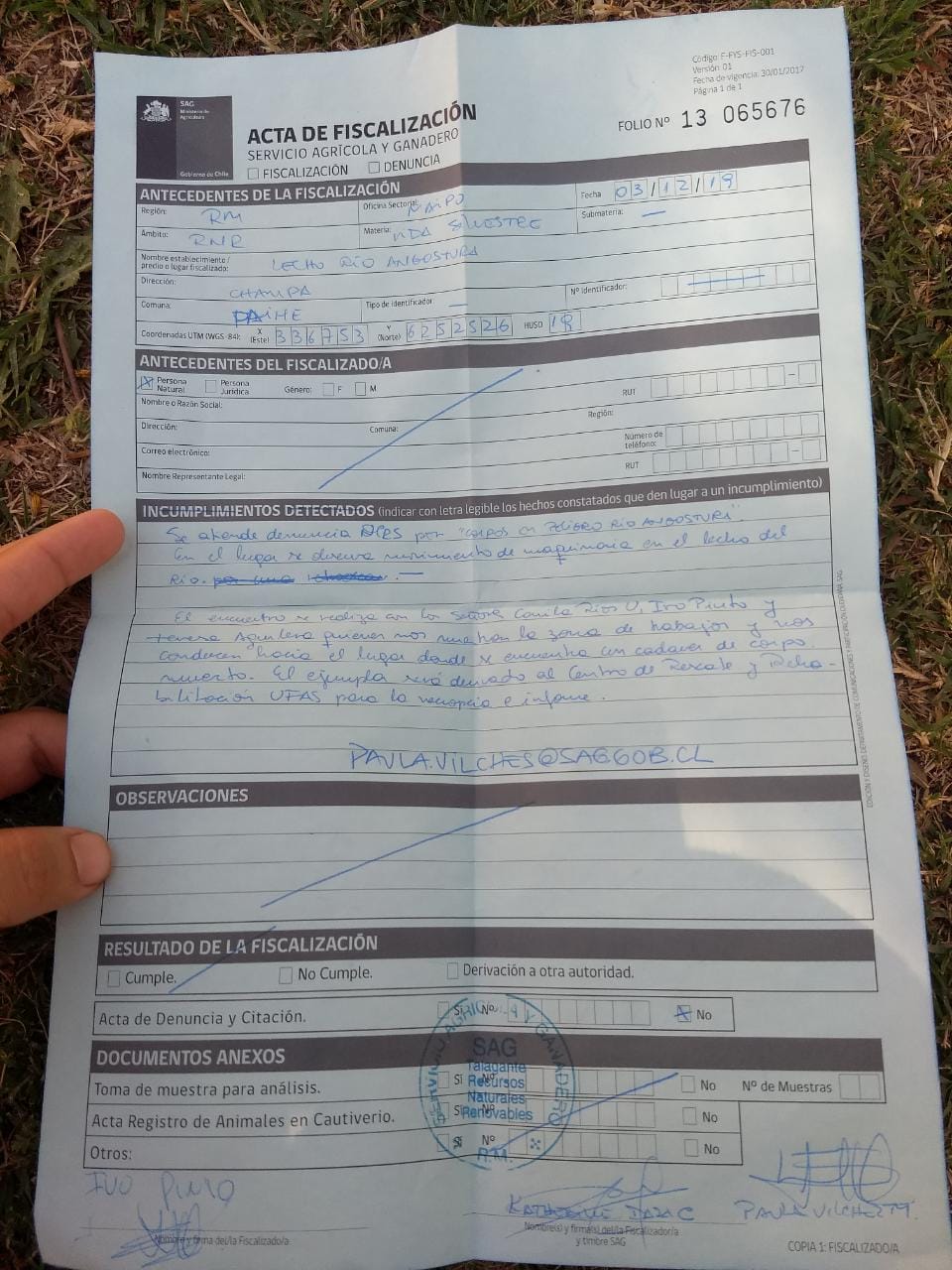 Los vecinos realizaron la denuncia respectiva al Servicio Agrícola y Ganadero (SAG), quienes fueron a inspeccionar el lugar. En tanto, la Municipalidad de Paine aseguró que no ha recibido ningún reclamo formal a través de su oficina de partes, pero sí el llamado de un vecino que denunció esta situación, por lo que derivó los antecedentes hacia la inspección de obras hidráulicas.