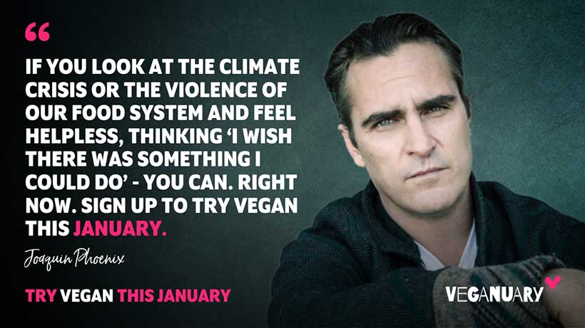 El actor Joaquin Phoenix -recientemente elegido Persona del Año por PETA- está invitando a todo el mundo a hacerse vegano por un mes en la campaña llamada Veganuary, un juego de palabras entre "veganismo" y "january" (enero en inglés).