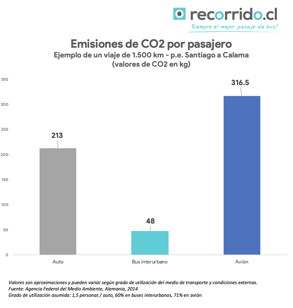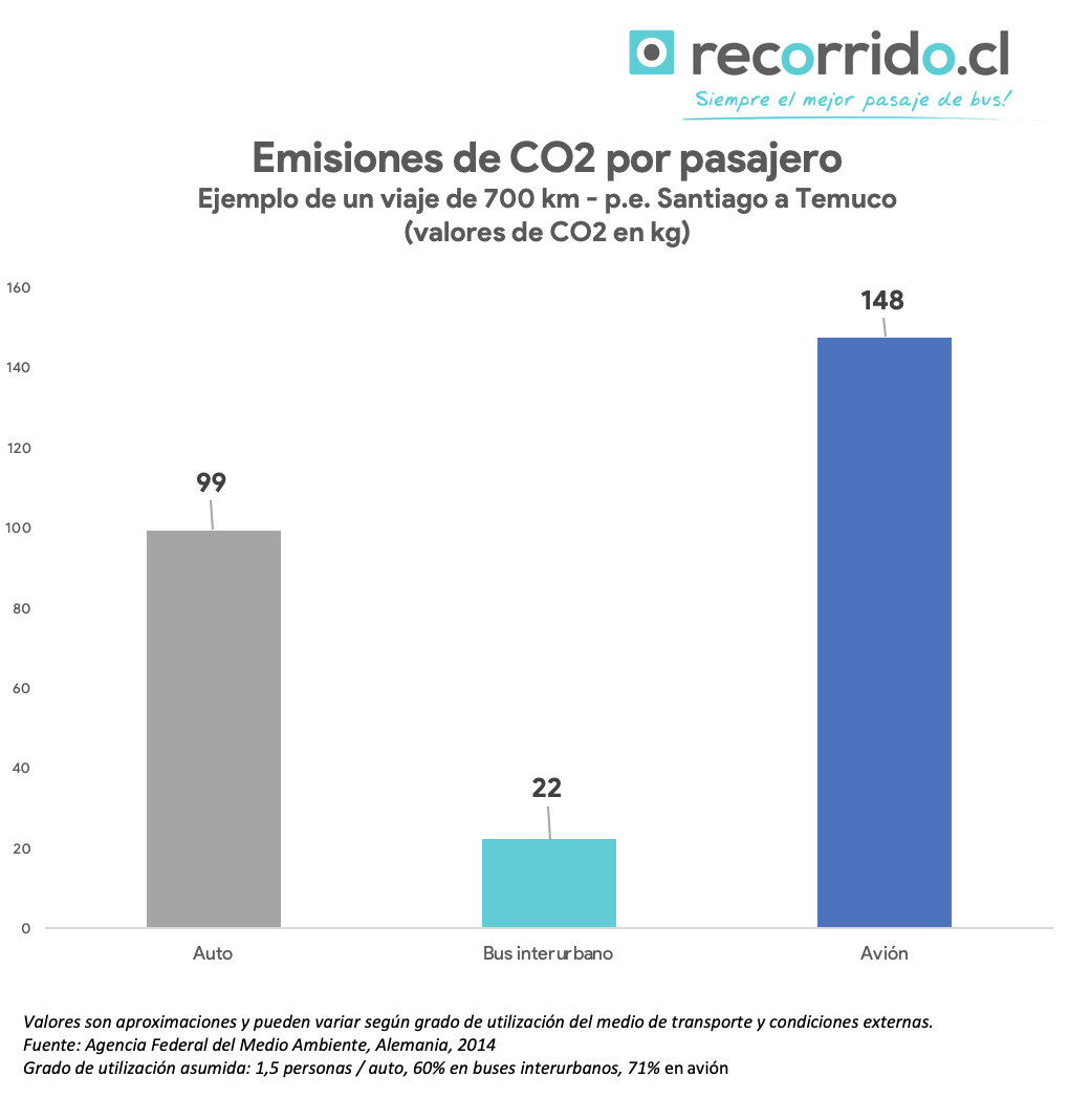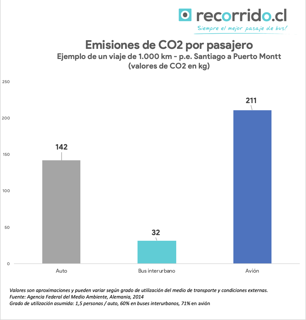 La medición, realizada por la plataforma de venta de pasajes de buses interurbanos Recorrido.cl en distancias de hasta 1.500 kilómetros, demostró que las emisiones de CO2 pueden disminuir hasta siete veces si el viaje se realiza en bus.