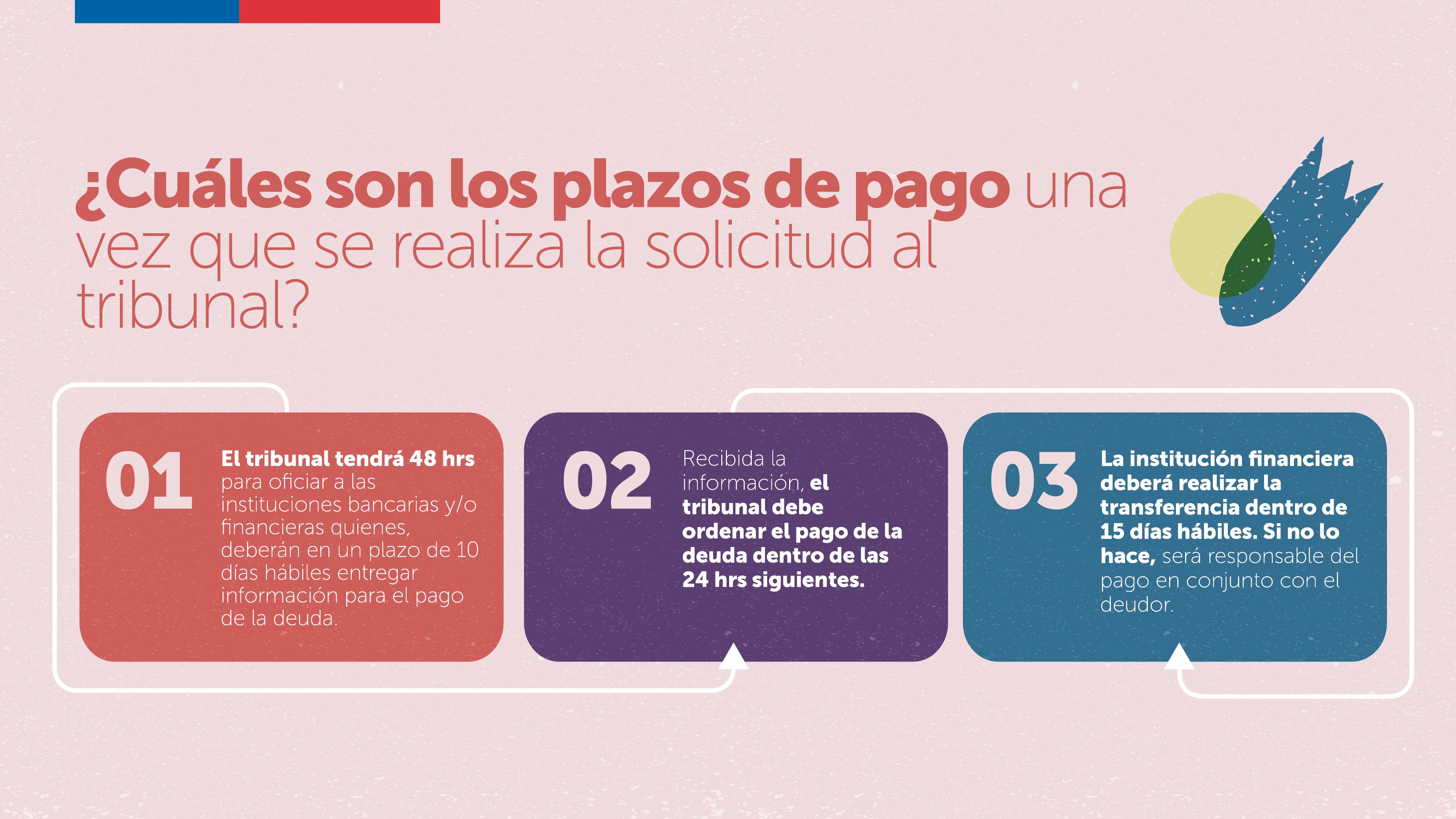 En caso de que se acredite la presencia de cuentas bancarias o algún instrumento de inversión a nombre del deudor, existirá un plazo de 48 horas desde que se llevó a cabo la solicitud para que el tribunal oficie a dichas instituciones con el objetivo de que en un plazo de 10 días hábiles se informe sobre los saldos y movimientos para que finalmente se haga efectivo el pago.