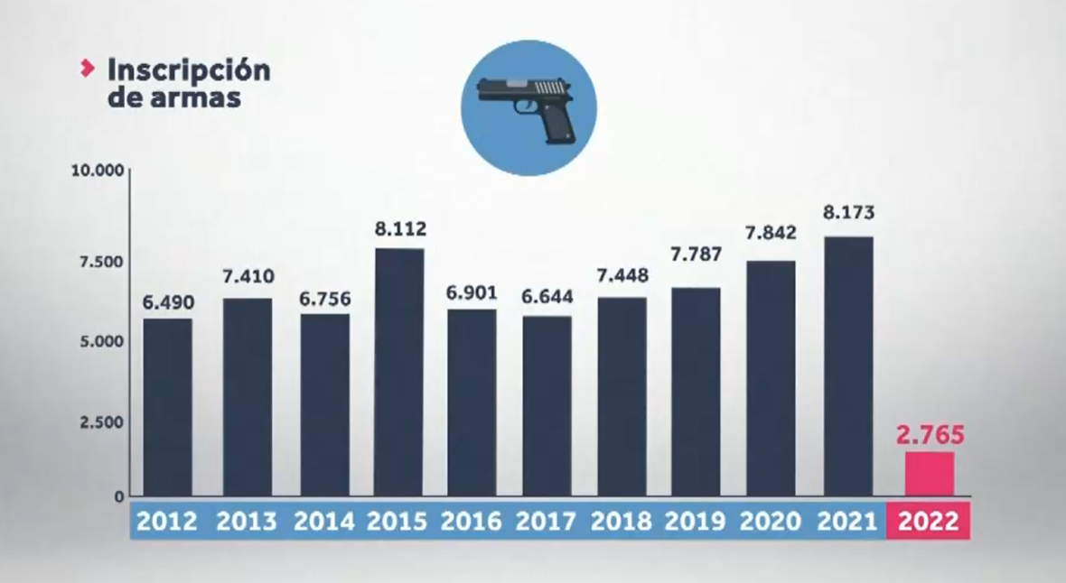 Los informes de la Dirección General de Movilización Nacional indican una tendencia al alza en la evolución de la inscripción de armas en Chile en los últimos 10 años. Si el 2012 se registraron 6.490 armas, ya en el 2020 se inscribieron 7.842; y el 2021 la cifra subió a 8.173. En lo que va de este año ya hay 2.765 armas inscritas.