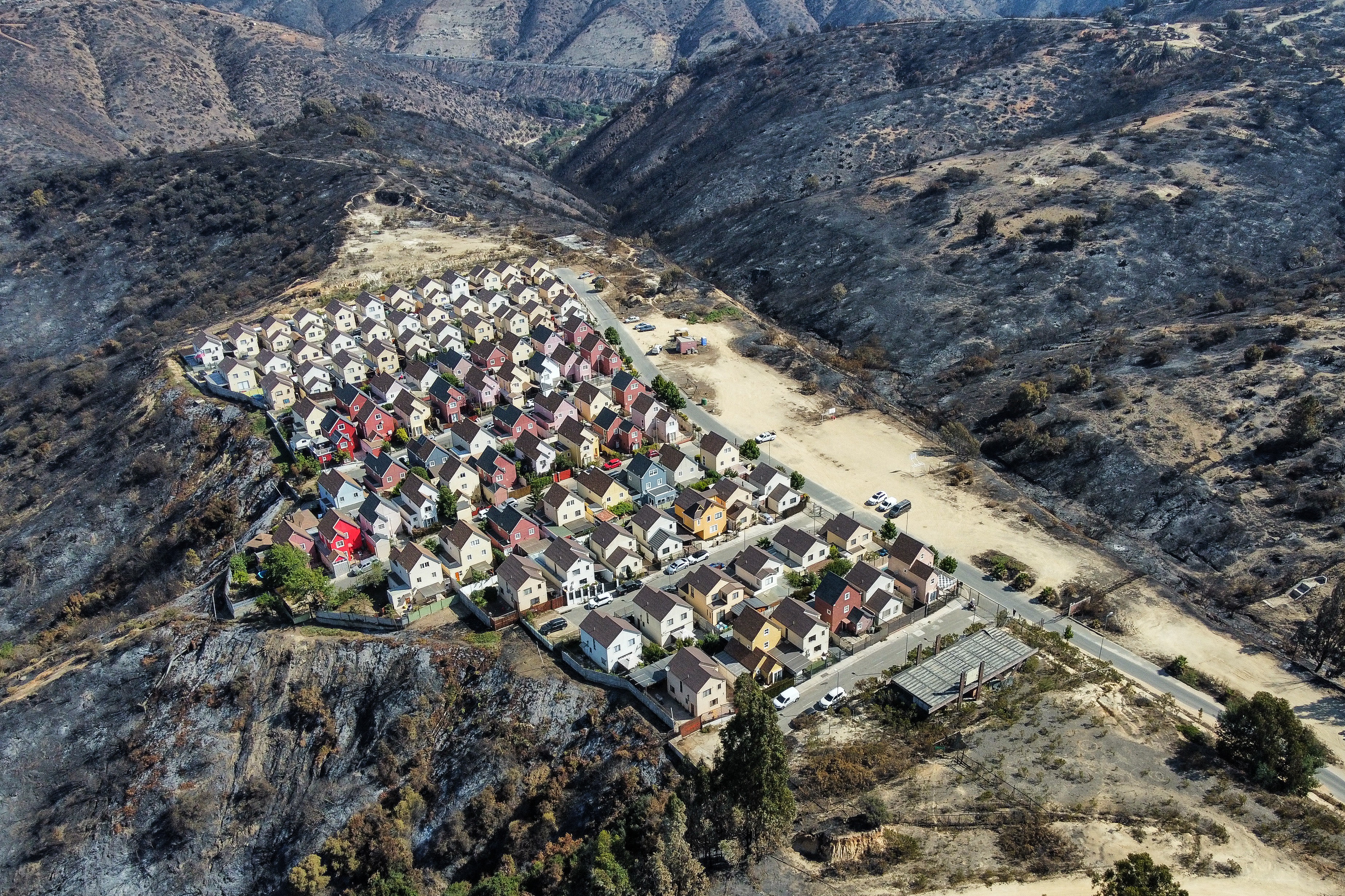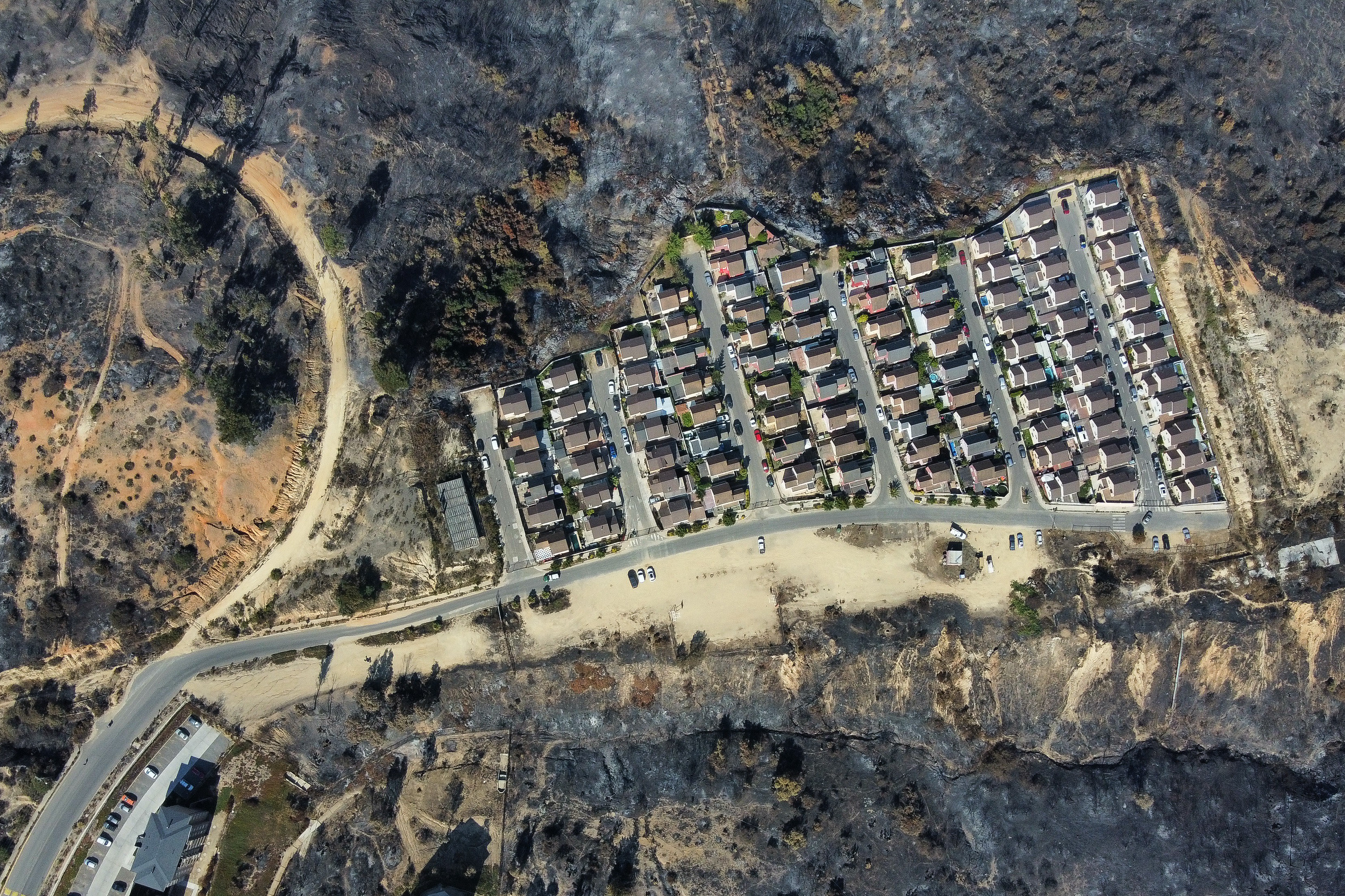 Los registros tomados desde un dron dan cuenta del límite que se produjo entre el paso de las llamas y las casas que sobrevivieron.
