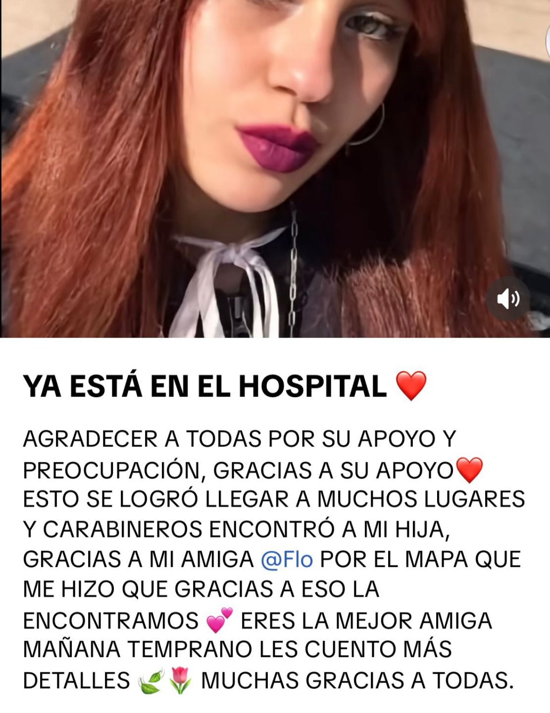 A través de sus redes sociales, la madre de la joven escribió: "Agradecer a todas por su apoyo y preocupación, gracias por su apoyo. Esto se logró (...) Carabineros encontró a mi hija".