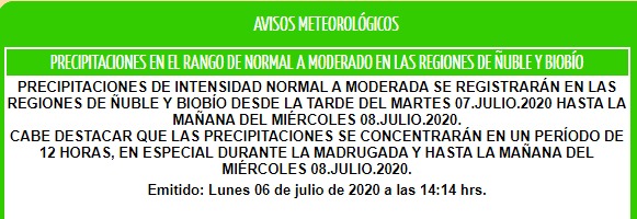 ¡Quinta semana consecutiva con lluvias sobre el centro y sur de Chile! Tanto así que la Dirección Meteorológica emitió un aviso por las “precipitaciones de intensidad normal a moderada que se registrarán en las regiones de Ñuble y Bío Bío desde la tarde de este martes (7 de julio) hasta la mañana del miércoles (8 de julio)"."Cabe destacar que las precipitaciones se concentrarán en un periodo de 12 horas, en especial, durante la madrugada y la mañana del miércoles”, informan.