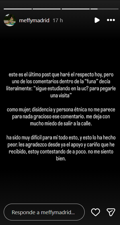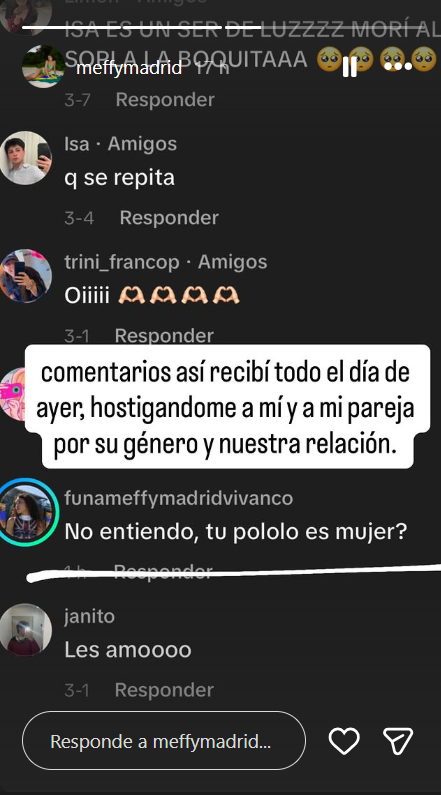 Magdalena también expuso mensajes donde personas preguntan si aún sigue estudiando, insinuando que su intención es ir a amedrentarla o agredirla a dicho lugar, así como también ha recibido comentarios homofóbicos en contra de su pareja.