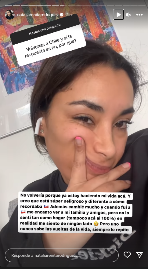 "No volvería, porque ya estoy haciendo mi vida acá. Y creo que está súper peligroso y diferente a cómo recordaba Chile", partió diciendo.