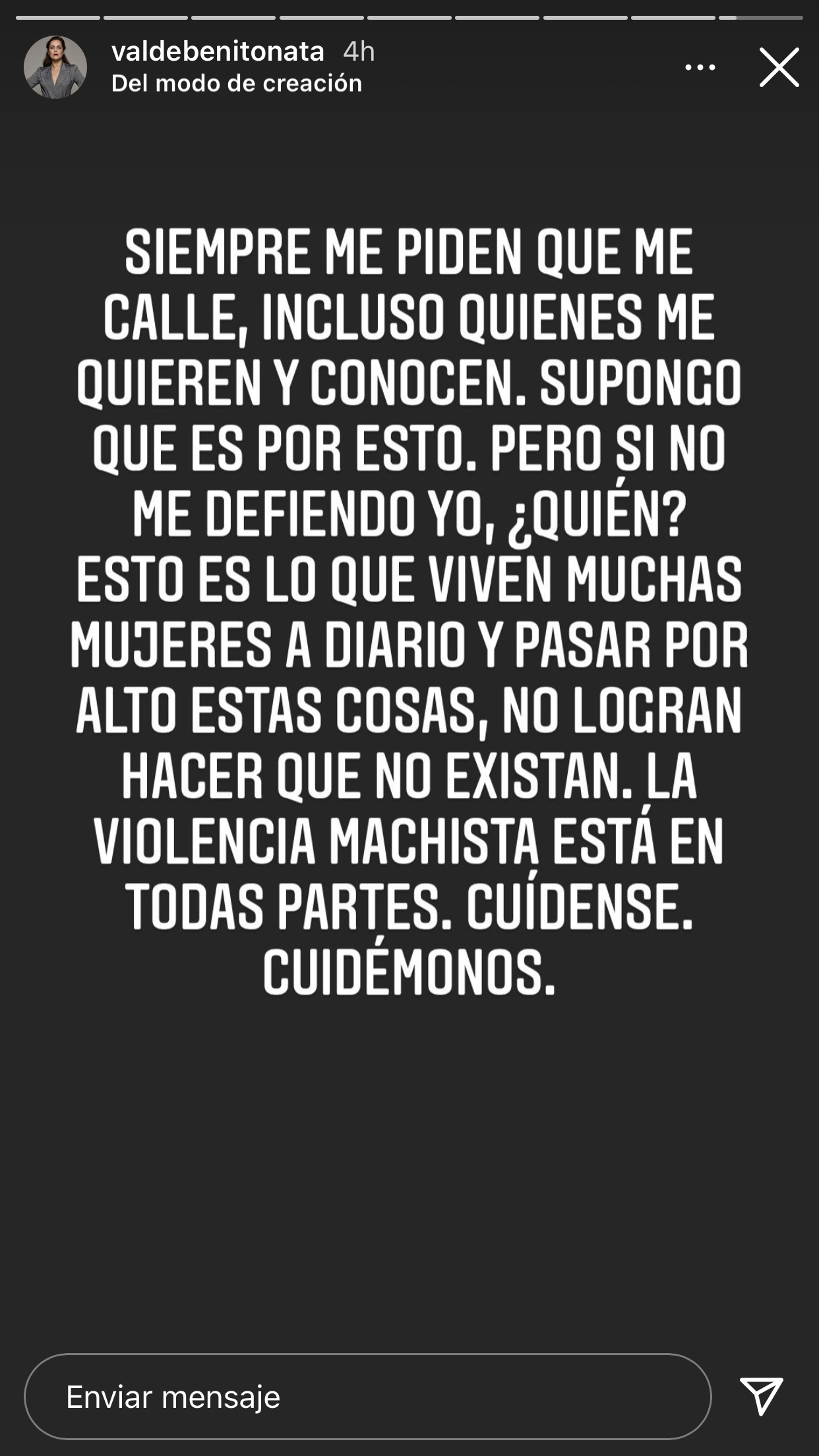 Finalmente, indicó que "esto es lo que viven muchas mujeres a diario y pasar por alto estas cosas, no logran hacer que no existan. La violencia machista está en todas partes. Cuídense, cuidémonos".