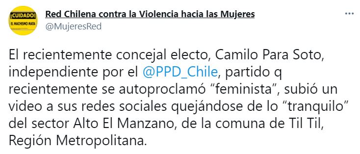 Por su parte, la Red Chilena Contra la Violencia Hacia las Mujeres sostuvo que "el recientemente concejal electo, Camilo Para Soto, independiente por el PPD, partido que recientemente se autoproclamó 'feminista', subió un video a sus redes sociales quejándose de lo 'tranquilo' del sector Alto El Manzano, de la comuna de Til Til, Región Metropolitana".