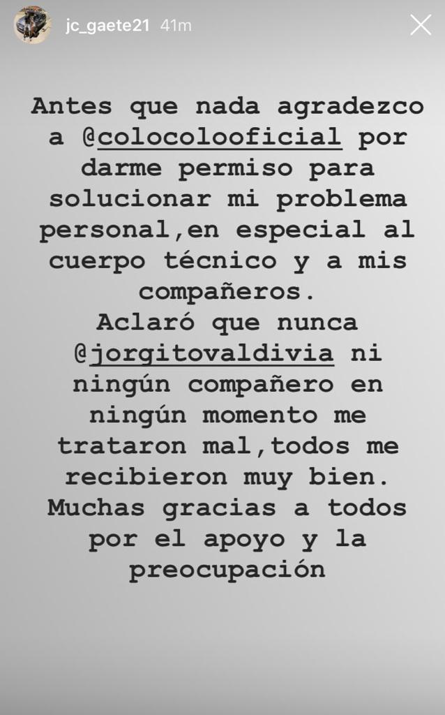 "Antes que nada agradezco a Colo Colo por darme permiso para solucionar mi problema personal, en especial al cuerpo técnico y mis compañeros" inició Gaete a través de una historia de Instagram.