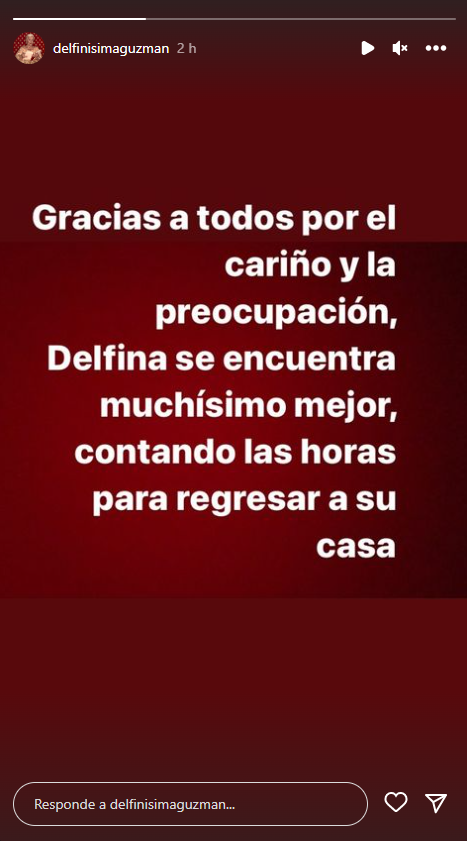 Durante la presente jornada, por medio del Instagram de Delfina Guzmán, también se indicó que la icónica protagonista de teleseries "se encuentra muchísimo mejor, contando las horas para regresar a su casa".