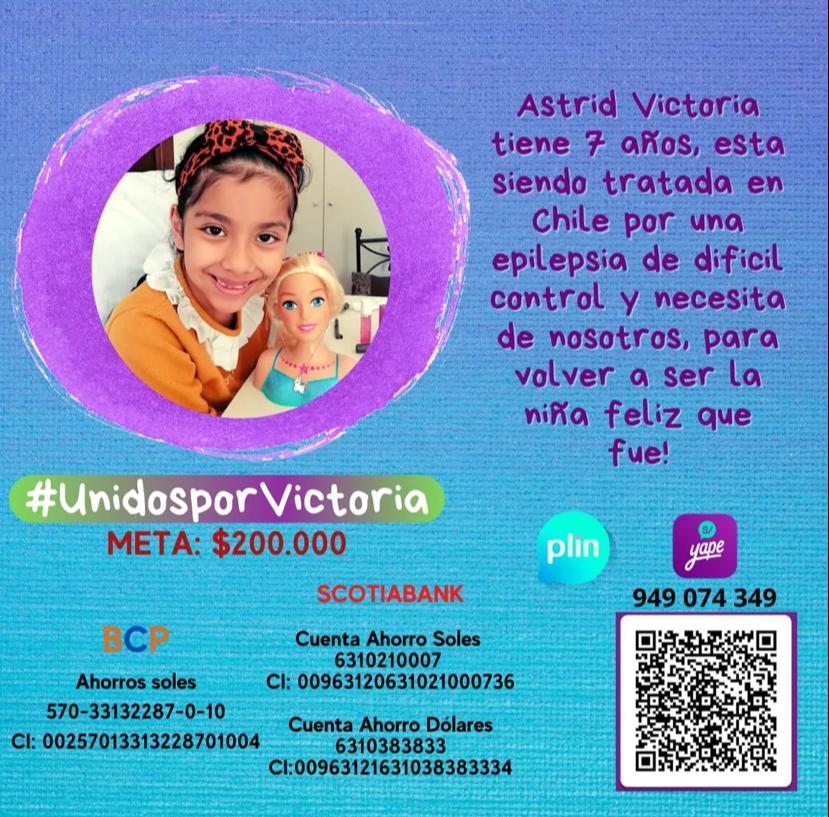 Astrid Victoria es peruana, tiene sólo siete años de edad y se encuentra hospitalizada en nuestro país. Lleva casi dos años presentando síntomas de epilepsia, pero aún no se sabe a ciencia cierta cuál es el origen del trastorno. Debido a ello, su tratamiento también es incierto. "Hace un año y diez meses inició con una convulsión que no paraba. La sedaron y tuvo un paro respiratorio, estuvo 20 días en la UCI", cuenta Rocío, madre de la menor.