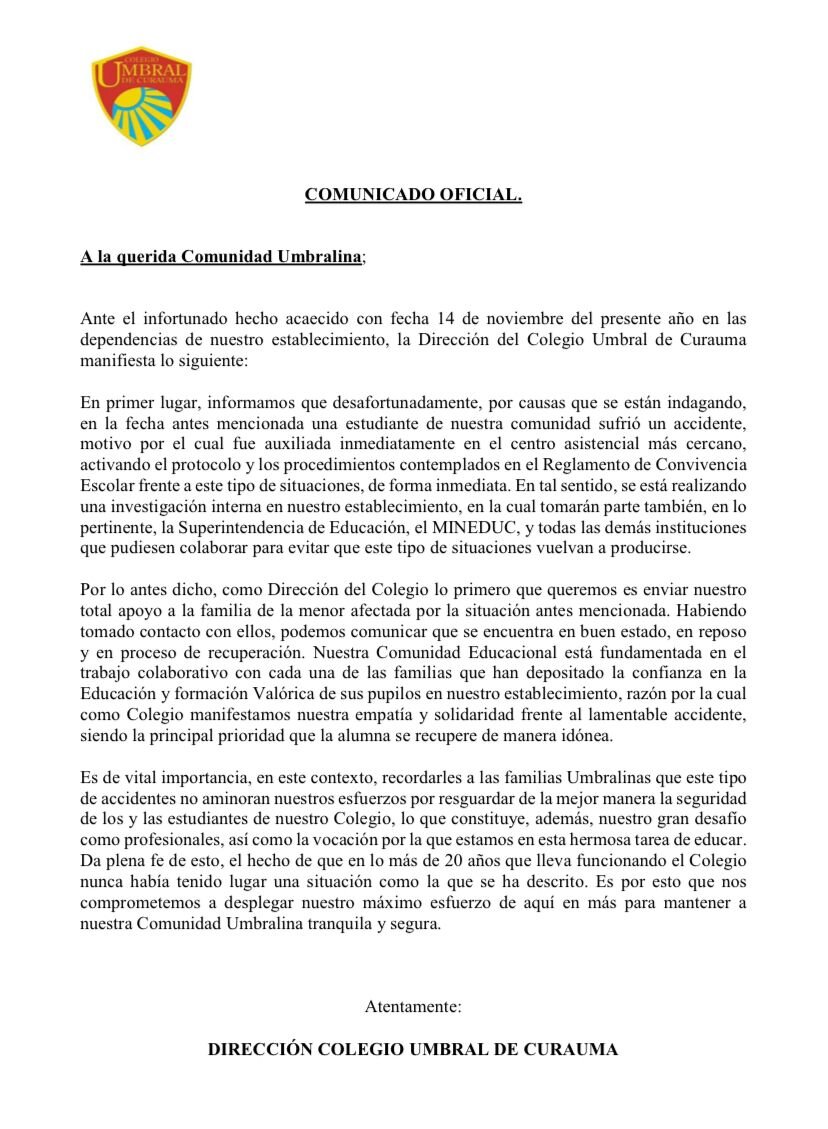 Frente a la carta de los padres y apoderados de los estudiantes, el Colegio Umbral de Curauma emitió un comunicado donde informa que "desafortunadamente, por causas que se están indagando, en la fecha antes mencionada una estudiante de nuestra comunidad sufrió un accidente".