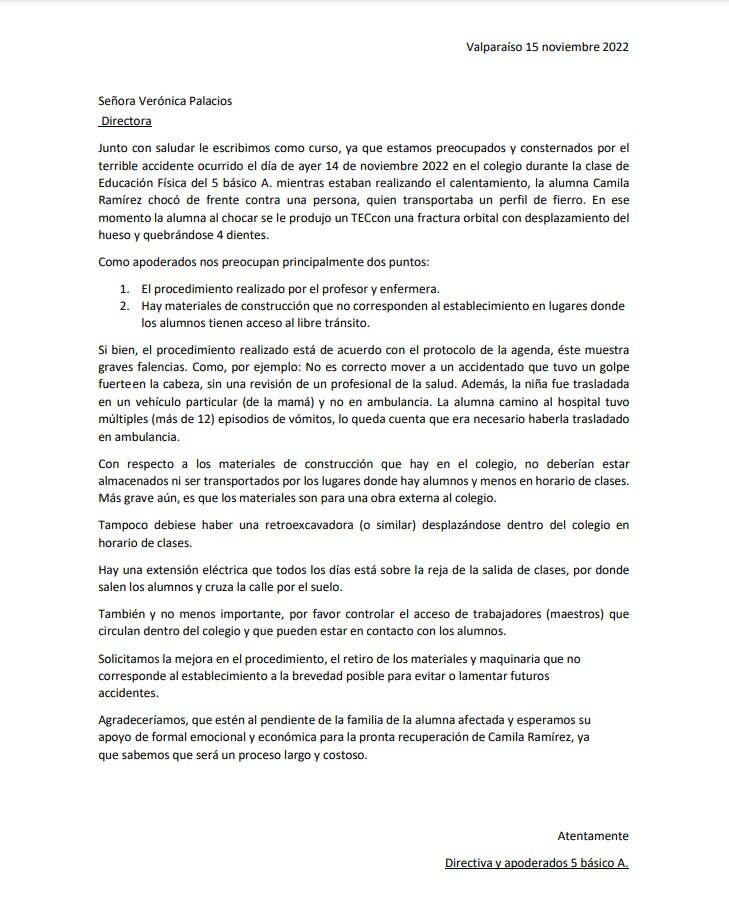 Además, una vez ocurrido el hecho, los apoderados del curso de la afectada tomaron la decisión de crear una carta, la cual entregaron de forma presencial y online. En ella escribieron que como apoderados se preocupan principalmente dos puntos: