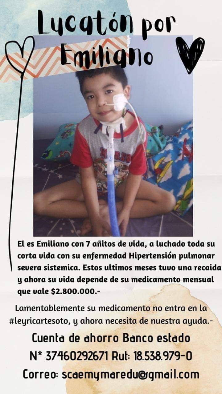 Emiliano tiene 7 años y no ha tenido tenido una vida fácil. Desde pequeño tiene daño pulmonar crónico y sufre de epilepsia e hipertensión pulmonar severa, por lo que debe usar ventilador mecánico y oxígeno. La madre del menor cuenta que su médico tratante le recomendó el medicamento Bosentan para regular su hipertensión. Sin embargo, tiene un costo de $2 millones y no lo cubre la Ley Ricarte Soto.