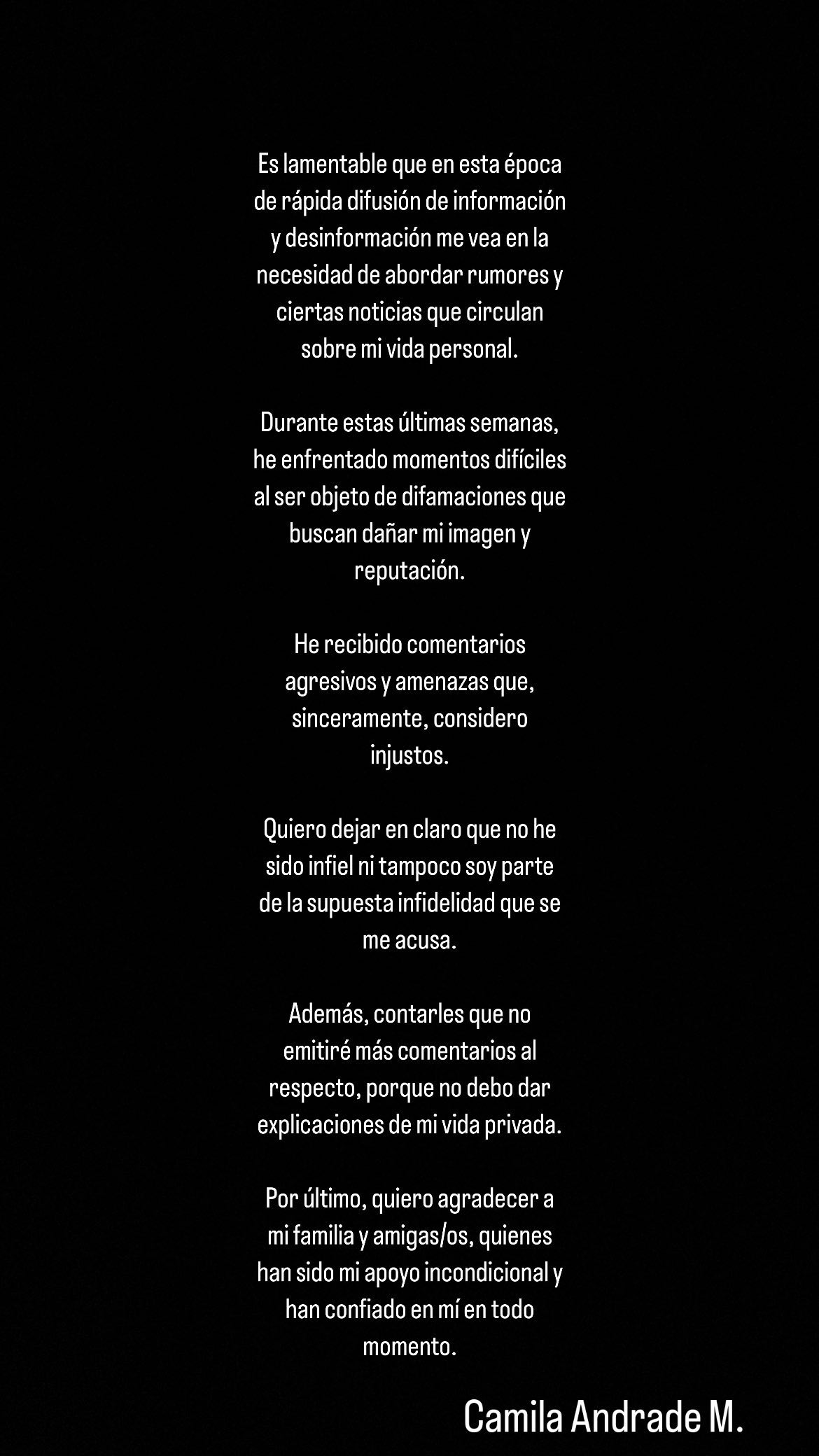 "Es lamentable que en esta época de rápida difusión de información y desinformación me vea en la necesidad de abordar rumores y ciertas noticias que circulan sobre mi vida personal", escribió Andrade.