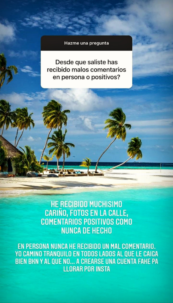 “He recibido muchísimo cariño, fotos en la calle, comentarios positivos como nunca de hecho. En persona nunca he recibido un mal comentario, yo camino tranquilo en todos lados”, declaró tras ser consultado acerca del trato que ha tenido tras salir de prisión.