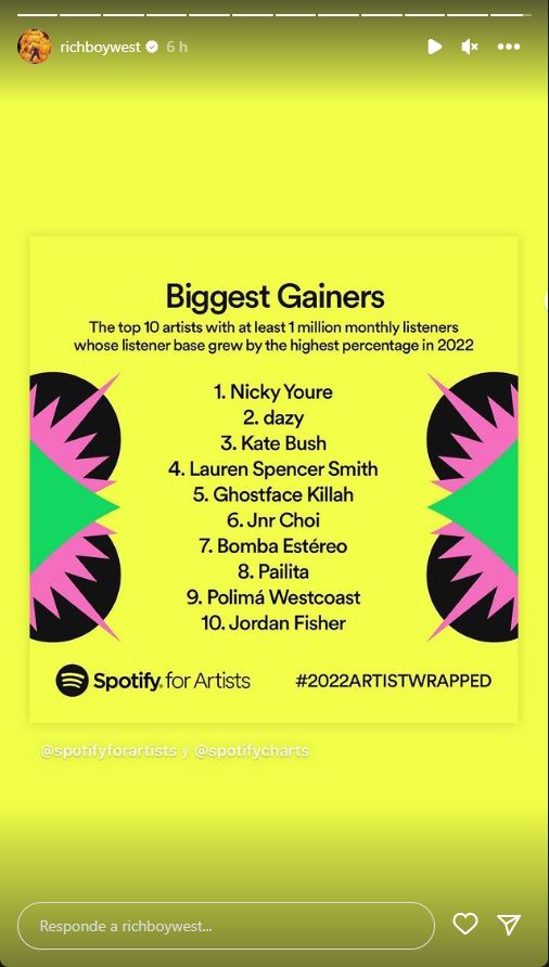 Pero Polimá, sin hacer referencia directa a esto, compartió una publicación de Spotify en la que se puede observar el listado de los 10 artistas que consiguieron al menos un millón de oyentes mensuales y cuyas reproducciones crecieron con el mayor porcentaje en 2022.