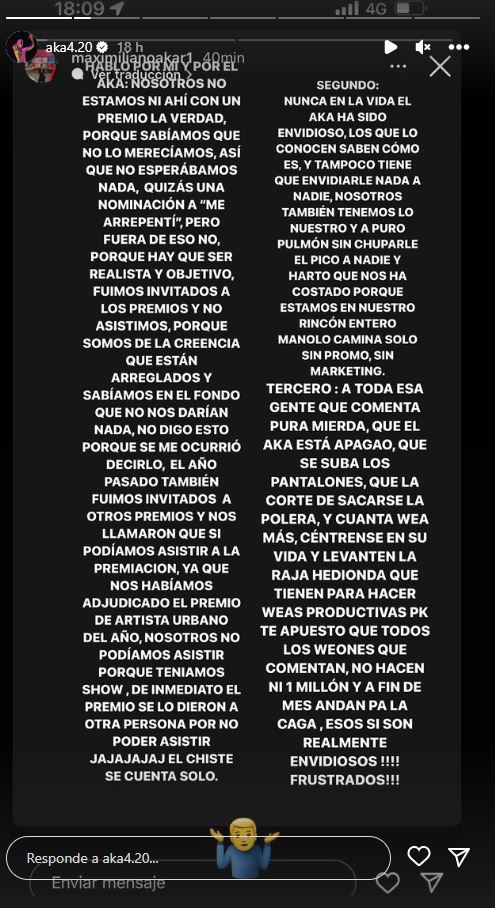 "Sus premios 'kls' son 'si me das algo, te nomino'. Son entero falsos programas 'ktm'", fue solo parte de la declaración que compartió en Instagram Maximiliano, quien sería parte del equipo de AK4:20.