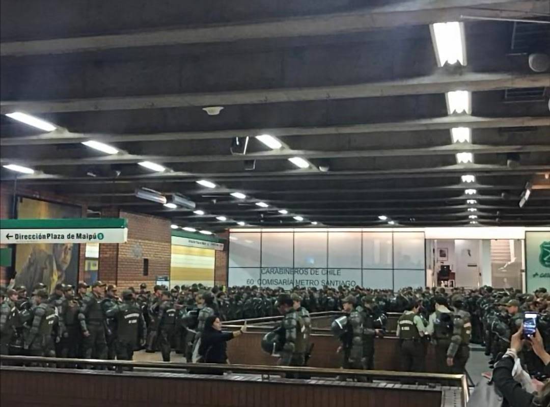 A través de redes sociales, los usuarios del tren subterráneo señalaron que un amplio contingente de Carabineros se encuentra instalado en las calles y al interior de las estaciones, especialmente en Baquedano y los Héroes.