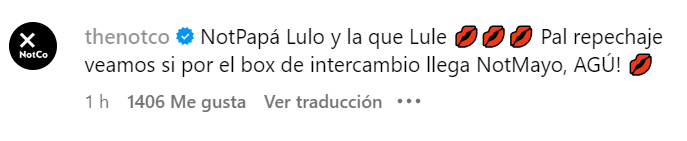 La publicación fue compartida en la cuenta de la empresa, quienes también dejaron un cómico comentario al Papá Lulo, haciendo un guiño al repechaje de Gran Hermano. "NotPapá Lulo y la que Lule 💋💋💋 Pal repechaje veamos si por el box de intercambio llega NotMayo, AGÚ! 💋", comentaron.