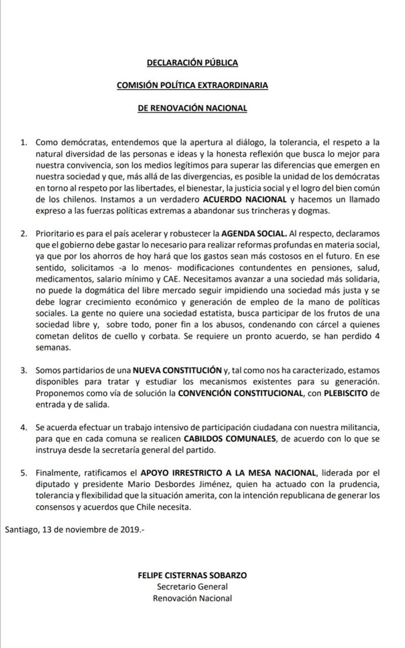 Así comienza la declaración pública que entregó este miércoles la Comisión Política Extraordinaria de Renovación Nacional, firmada por Felipe Cisternas, secretario general del partido en la que llaman a realizar un acuerdo nacional por la agenda agenda social y una nueva Constitución con plebiscito de entrada y salida.
