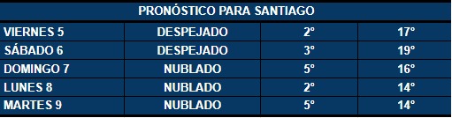 Las lluvias intensas afectarán Aysén y zonas de Palena en Los Lagos. De acuerdo con el pronóstico del Departamento Meteorológico de Turner, las precipitaciones llegarían hasta Biobío por el norte durante este sábado. El domingo, los chubascos alcanzarían zonas de Ñuble y es probable que el lunes abarquen al Maule. Este jueves hubo heladas con registros que alcanzaron -3° en sectores de Colina y Pirque en la Región Metropolitana. Santiago tuvo la mañana más fría en lo que va del año con 1,5° de mínima en la Quinta Normal.Ese viernes, las mínimas serán muy similares en los valles centrales. Las heladas locales se quedarían hasta el sábado en los valles.