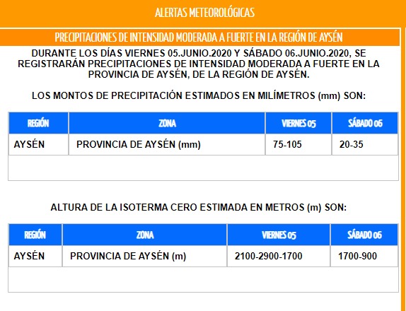 Coyhaique es la única ciudad del centro-sur del país con superávit de agua caída a la fecha. Eso se debe al numeroso paso de sistemas frontales por la zona, los cuales han recibido el aporte de ríos atmosféricos durante el presente otoño. Lee también:No decretó cuarentena: Suecia reconoce que debió adoptar estrategia más estricta contra el COVID-19Este es el caso nuevamente, por lo que la Dirección Meteorológica de Chile emitió una alerta para ese sector del país. “Durante este viernes (5 de junio) y sábado (6 de junio) se registrarán precipitaciones de intensidad moderada a fuerte en la provincia de Aysén”, anticipa el organismo oficial.Según informa, habrá lugares que podrían acumular hasta 140 milímetros de agua en este evento. Mientras, la isoterma 0 rondará 2.000 metros de altitud este viernes y bajaría a 900 metros el sábado.