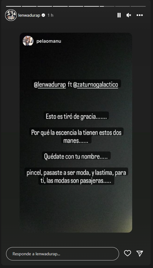 En una siguiente publicación, Lenwa Dura compartió una reflexión del usuario @pelaomanu, donde señaló "Lenwa Dura ft. Zaturno. Esto es Tiro de Gracia, porque la esencia la tienen estos dos manes".