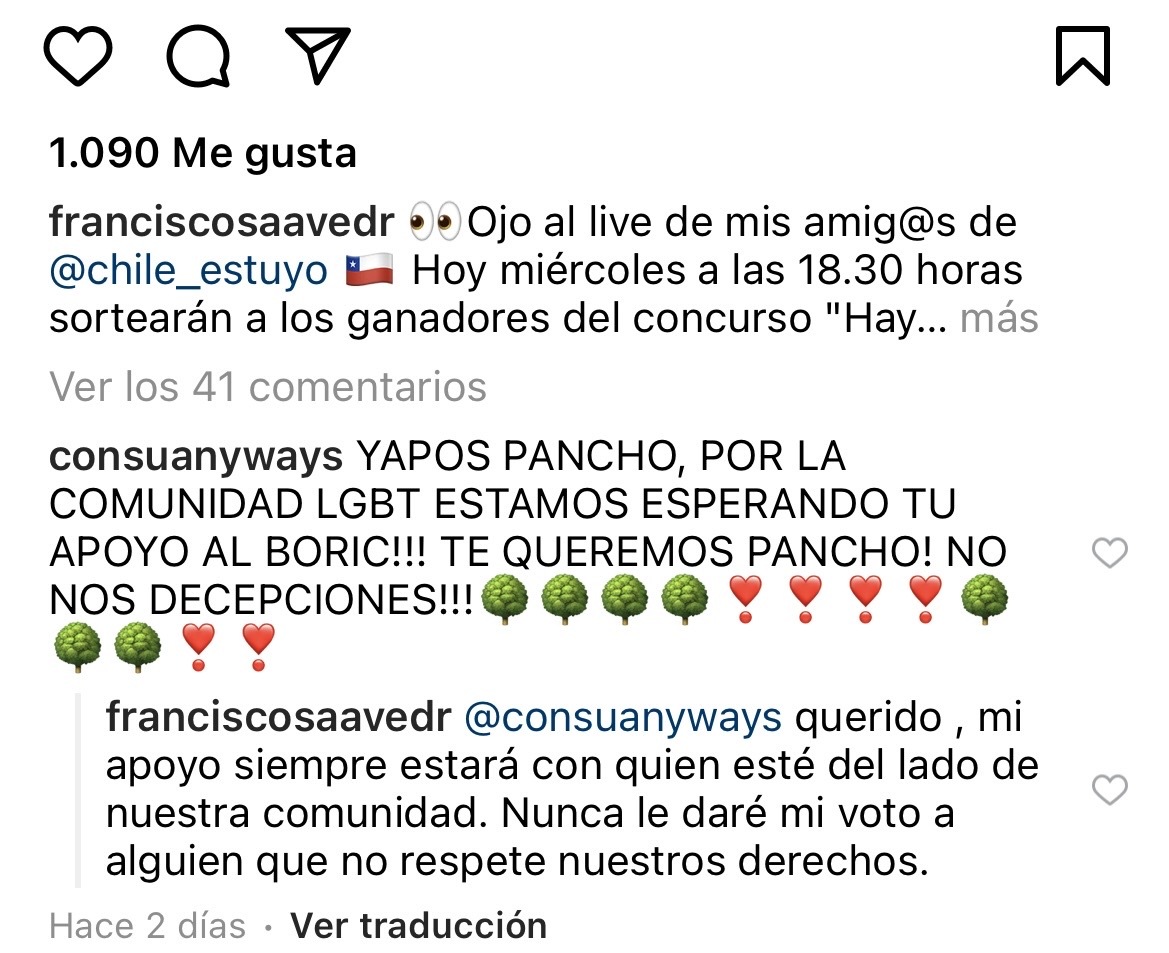 En una publicación en su cuenta de Instagram, el animador recibió el comentario de un seguidor: "Yapo Pancho, por la comunidad LGBT estamos esperando tu apoyo al Boric!!!", palabras que estaban acompañadas de varios emojis de árboles, símbolo de la campaña que ha realizado el diputado.