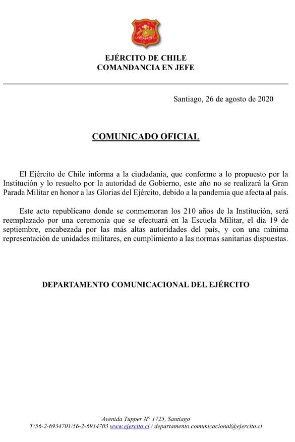 A través de un comunicado, la institución informó que "este año no se realizará la Gran Parada Militar en honor a las Glorias del Ejército debido a la pandemia que afecta al país".