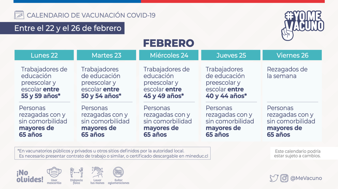 También insistió en que el miércoles, además, es el turno de los trabajadores de la educación escolar y prescolar entre 45 y 49 años.