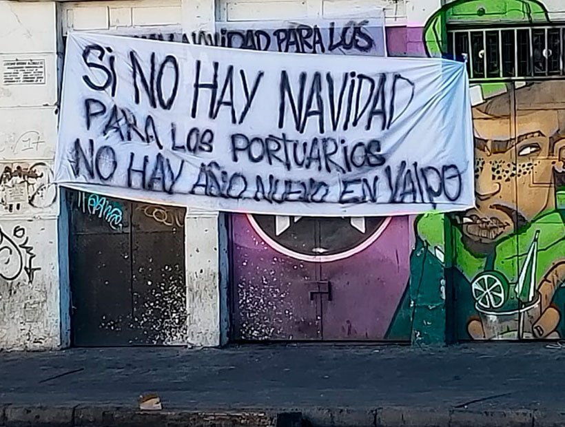"Si no hay navidad para los portuarios, no hay año nuevo en Valpo", señala el cartel, por lo que podrían tomar medidas para impedir el lanzamiento de los fuegos artificiales desde la zona puerto, uno de los principales atractivos del país para comenzar el año.