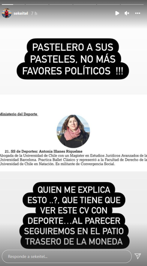 "¿Quién me explica esto? ¿Qué tiene que ver este CV con deporte? Al parecer seguiremos en el patio trasero de La Moneda", añadió Keitel en su publicación.