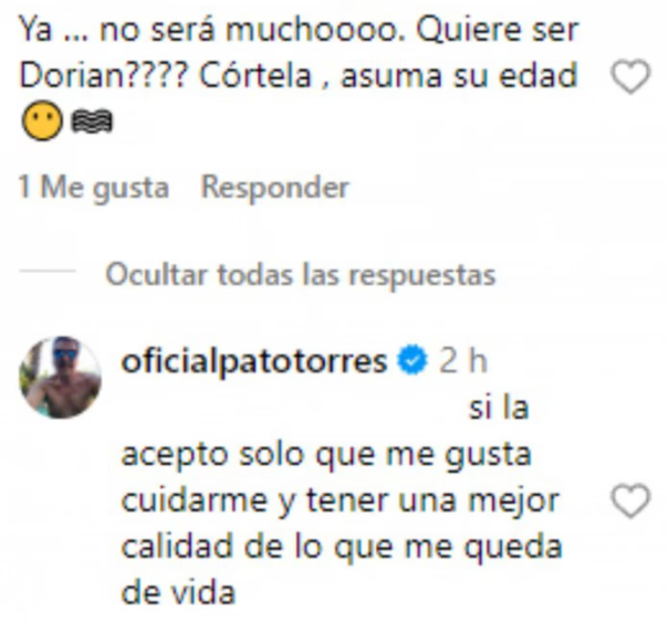 ¿No será mucho? Quiere ser Dorian? Córtela, asuma su edad", fue el comentario de una seguidora que lo comparó con el conocido personaje del libro "El Retrato de Dorian Gray", quien tenía una fijación con verse eternamente joven.