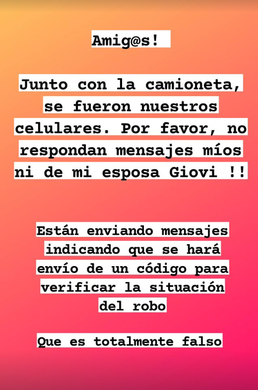 Junto con la camioneta, se fueron nuestros celulares. Por favor, no respondan mensajes míos ni de mi esposa Giovi", alertó en redes sociales.