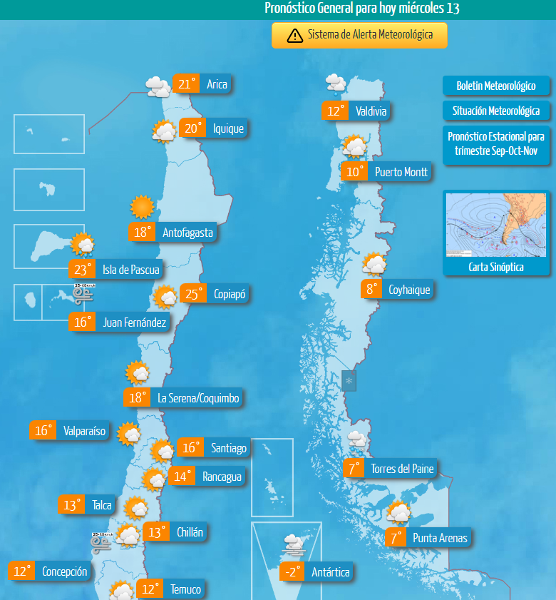 Revisa el pronóstico para este miércoles 13 de septiembre de la Dirección Meteorológica de Chile en el resto del país: