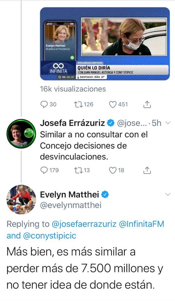 Errázuriz aprovechó las palabras de Matthei para criticarla por los despidos que se registraron el 8 de abril en la Municipalidad de Providencia. "Similar a no consultar con el concejo decisiones de desvinculaciones", tuiteó la ex alcaldesa.